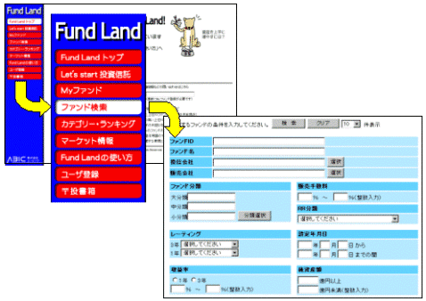 「こんなファンドないかな?」をいくつかの条件から、検索することができます。 たとえば、過去1年間の収益率が50%以上とか○○銀行で取り扱ってるファンドなどの条件 を指定すると、該当するファンドが一覧表示されます。 検索条件はすべて「&(アンド)検索」になっているので、条件が多くなれば、それだけファン ドを絞り込むことが可能です。 |